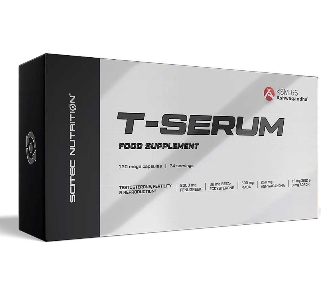 T-Serum es un complejo de 6 ingredientes vegetales y minerales. Además de los conocidos extractos de plantas como el extracto de semillas de alholva (fenogreco), la beta-ecdisterona extraída de las hojas de espinaca, el extracto de raíz de ashwagandha KSM-66® de marca registrada y el polvo de raíz de maca, la fórmula también incluye zinc y boro.